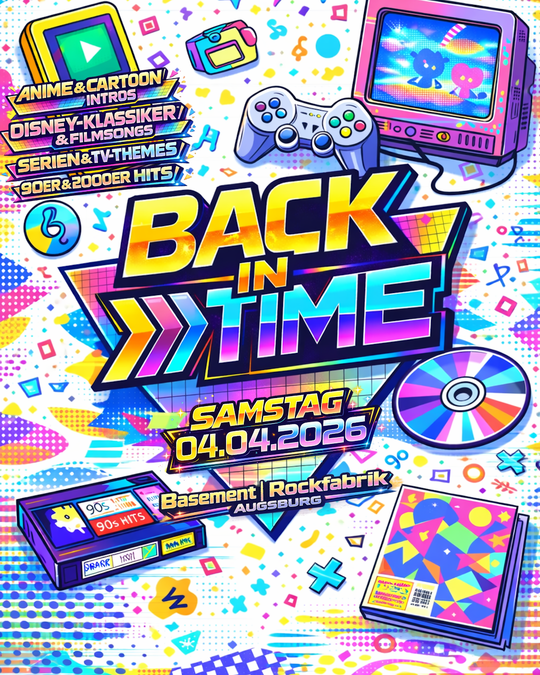 Die Premiere steigt am Samstag, den 04.04.2026, im Basement der Rockfabrik Augsburg. Die Nacht richtet sich an alle, die mit den Hits und Helden der 90er und 2000er groß geworden sind, ebenso wie an jene, die dieses Lebensgefühl neu für sich entdecken möchten. Abseits der Tanzfläche lädt eine kleine Nostalgie-Zone mit Fotowand und Retro-Konsole zu einer kurzen Zeitreise ein, bevor es wieder zurück ins Getümmel geht.